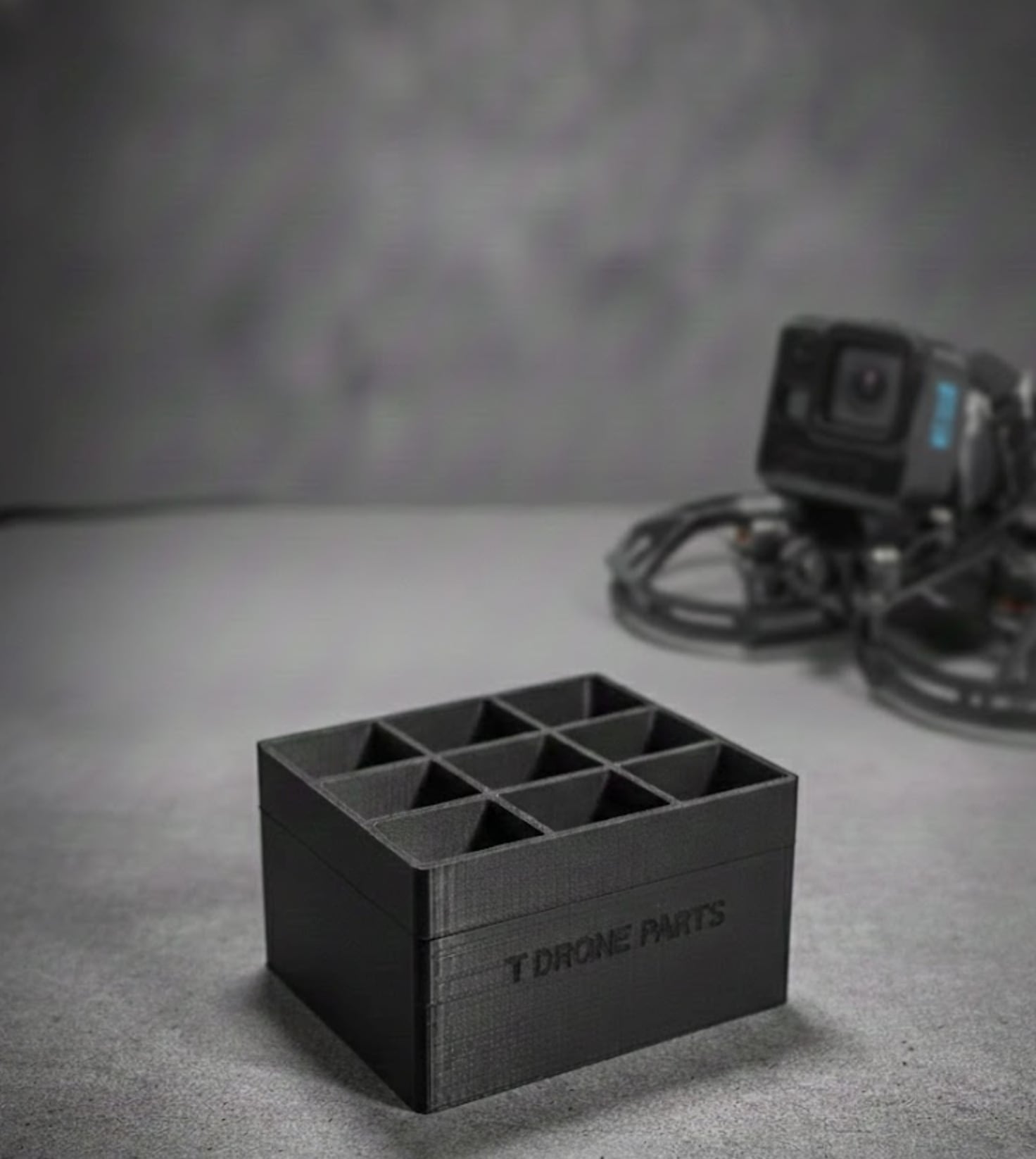 あなたの大切なLiPoバッテリーを整理整頓するために設計された「LiPoバッテリーケース (9本用)」。このケースは、幅16mm、厚み21mm以下のLiPoバッテリーに対応しており、3x3の配置で合計9本のバッテリーを収納可能。高さは約40mm、壁の厚さは2mmというしっかりとした作りで、大切なバッテリーを外部からの衝撃や埃から守ります。マットな黒のPLA素材を使用したデザインは、シンプルながらもスタイリッシュ。どんな環境にもフィットし、持ち運びにも適しているため、アウトドアやレースシーンでも安心です。